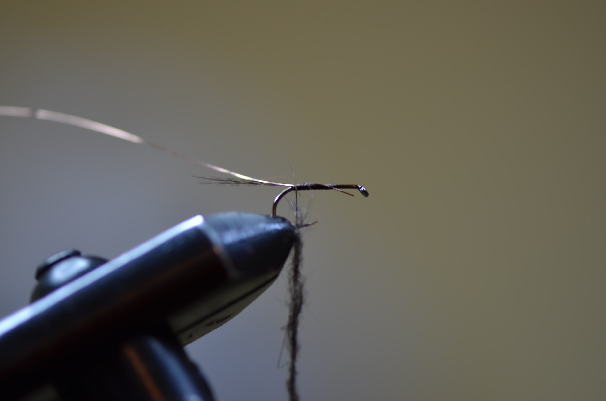 enrouler le dubbing pour former le thorax et mettre dans la boucle les grands poils de lièvre et twister